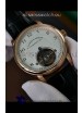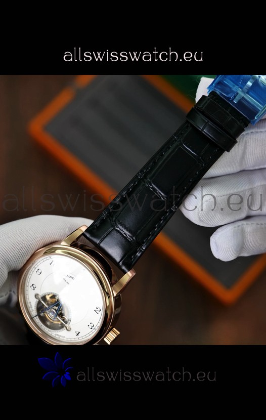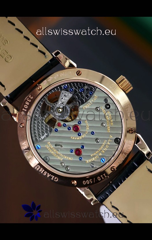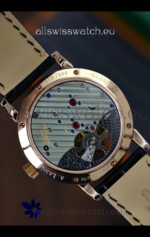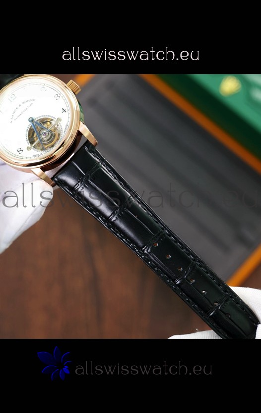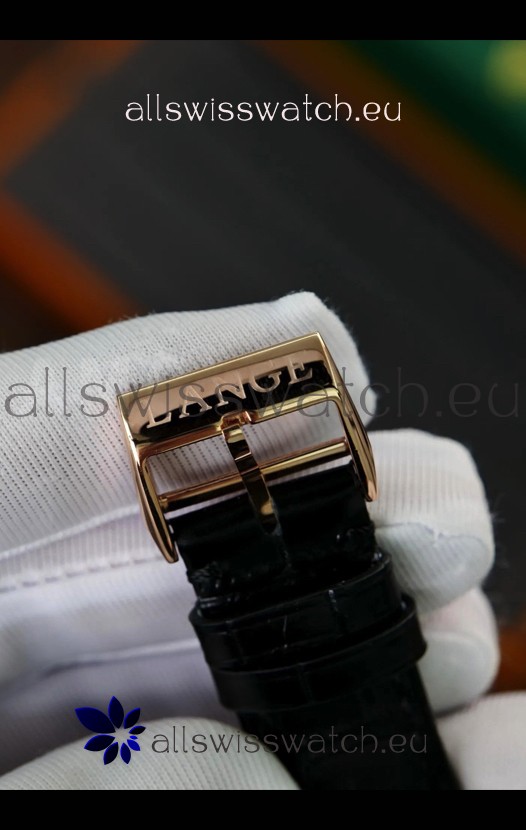 Genuine Black Leather Strap with A.Lange Sohne Stamped Markings on Strap. Polished Stainless Steel Rose Gold Clasps.