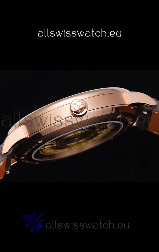 18K Rose Gold Plating on 904 Polished Solid Stainless Steel Case with Open Case Back Cover in Steel. Polished Bezel.