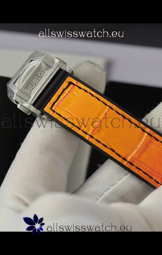 Genuine Hybrid Leather/Rubber Strap with Steel Folding Clasp complete with Hublot Markings and Engravings.
