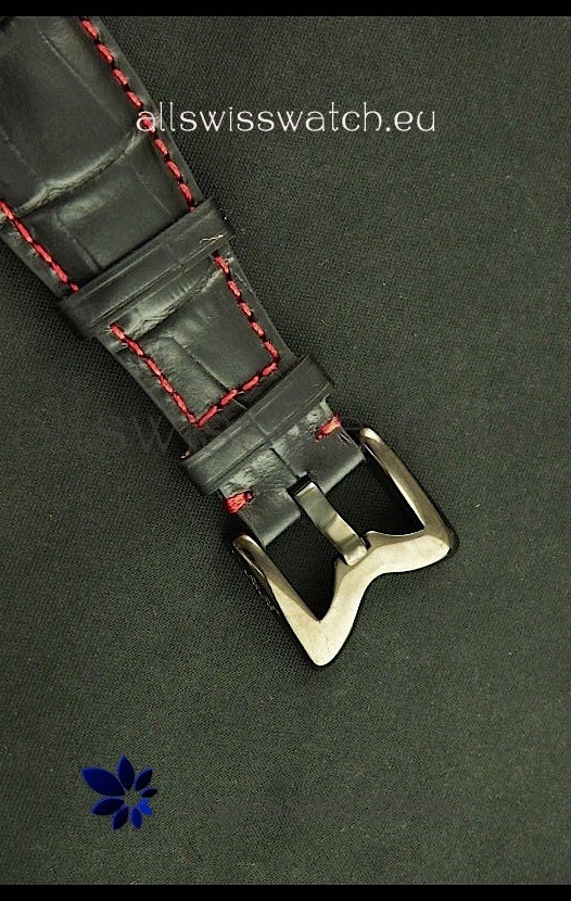 Strap: Red Stitched Black Leather Strap with Tang Buckle
