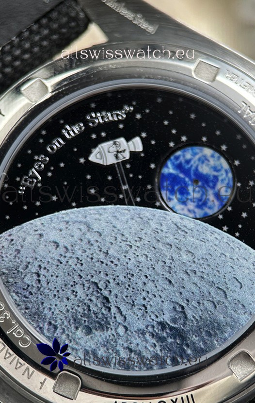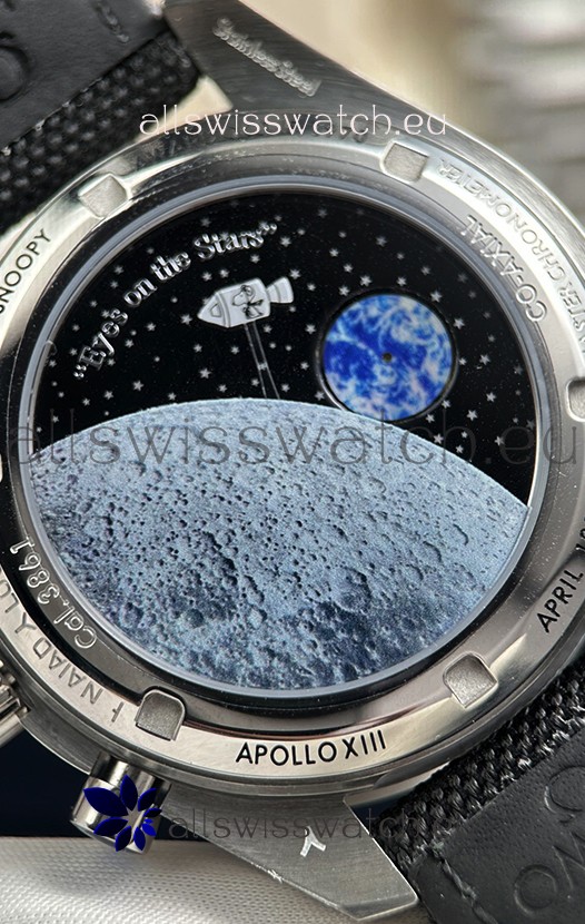 The Globe Located at the rear would rotate and complete one revolution per Minute, the Snoopy on Spaceship would rotate counter clockwise in conjunction to the Chronograph second hand once the Chronograph feature is activated.