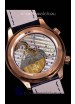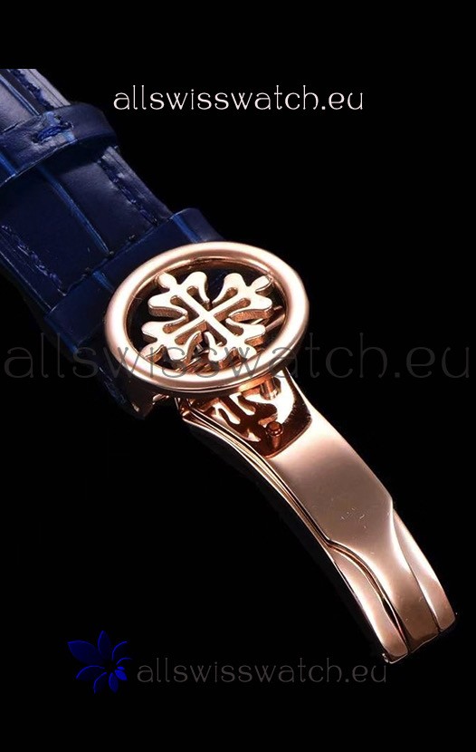 Genuine Swiss 9015 Movement assembled to Resemble the Authentic Patek Philippe PP 240 Calibre Style Movement. Updated Rotor, Bridged and Engravings on Movement with Rose Gold Plated Patek Philippe Stamped Rotor