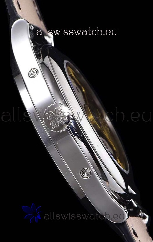 Genuine Swiss 9015 Movement assembled to Resemble the Authentic Patek Philippe PP 240 Calibre Style Movement. Updated Rotor, Bridged and Engravings on Movement with Rose Gold Plated Patek Philippe Stamped Rotor