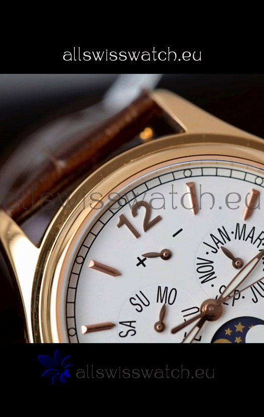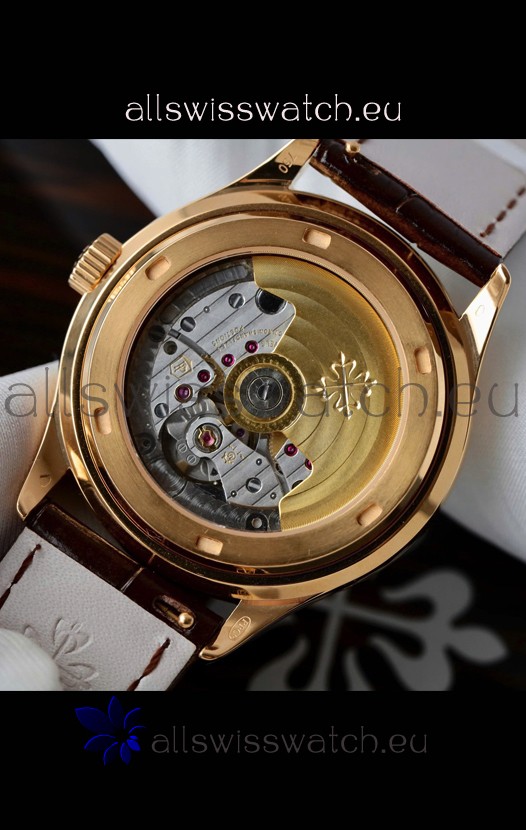 Genuine Swiss 9015 Movement assembled to Resemble the Authentic Patek Philippe PP 324 Calibre Style Movement. Updated Rotor, Bridged and Engravings on Movement with Rose Gold Plated Patek Philippe Stamped Rotor