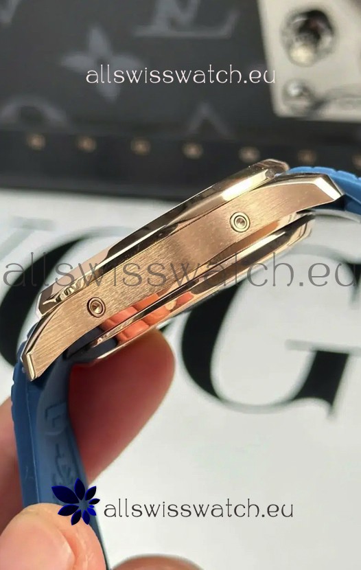 18K Rose Gold Plating on 904L Polished Stainless Steel Case with Brushed Bezel exactly as per the original