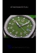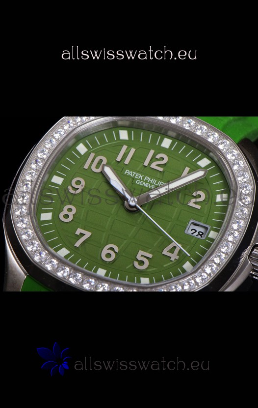 Green Colored Textured Dial with Date Window at 3 O'Clock. Diamonds Bezel