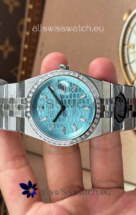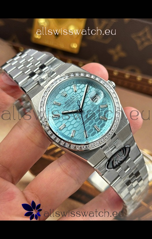 Ice Blue Honeycomb dial with Date Indicator. Diamonds Bezel
