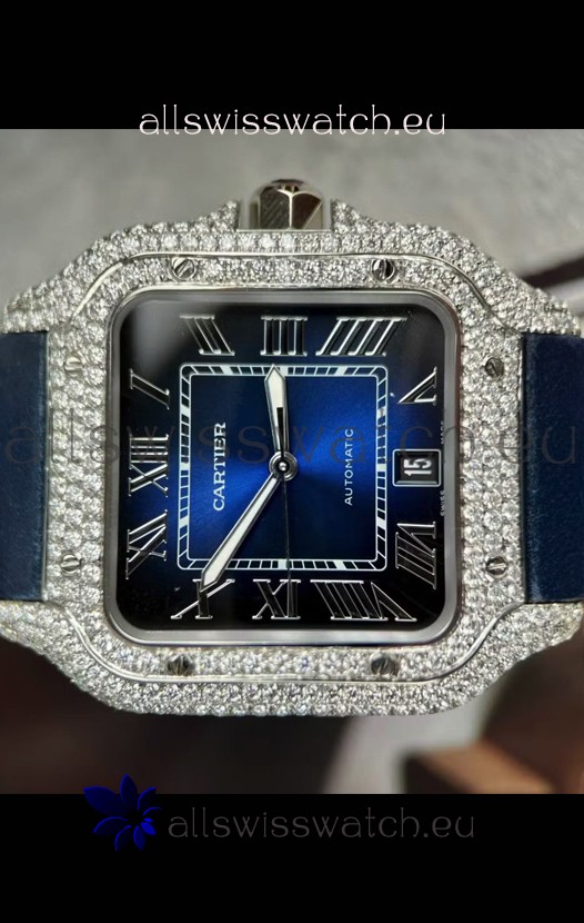 Santos De Cartier Watch in Blue Dial 39.50MM MOSSANITES Paved Bezel Swiss Replica Watch