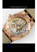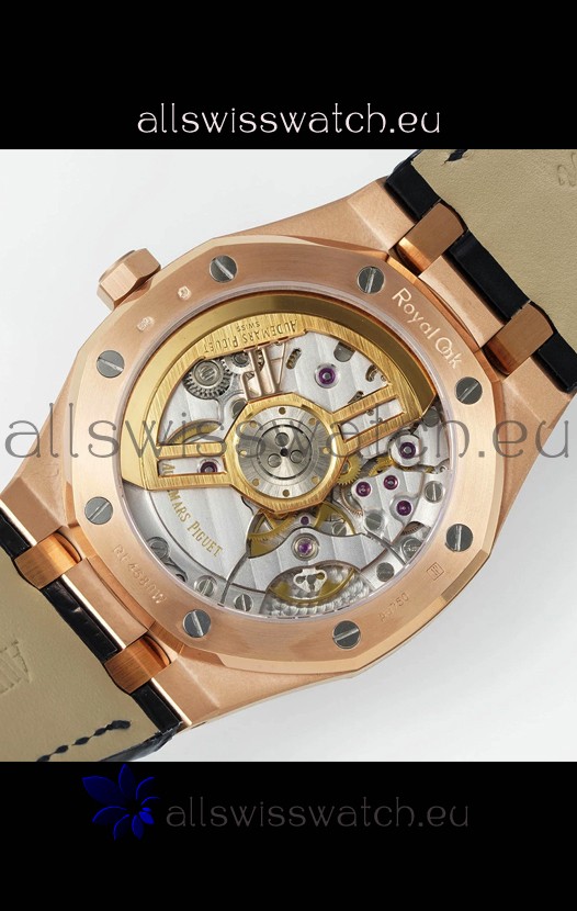18K Rose Gold Plating on 904L Solid Stainless Steel Case and Bezel. Open Case Back with Stainless Steel Cover