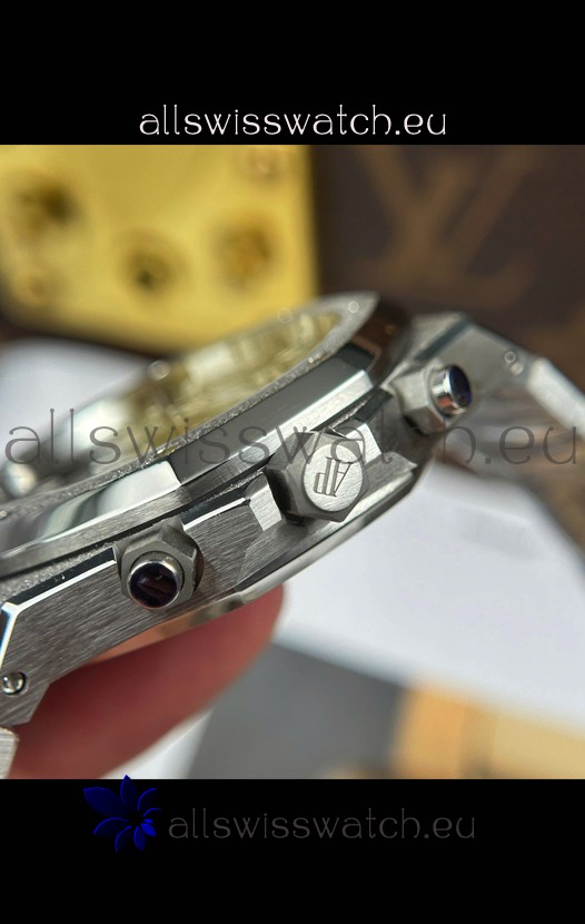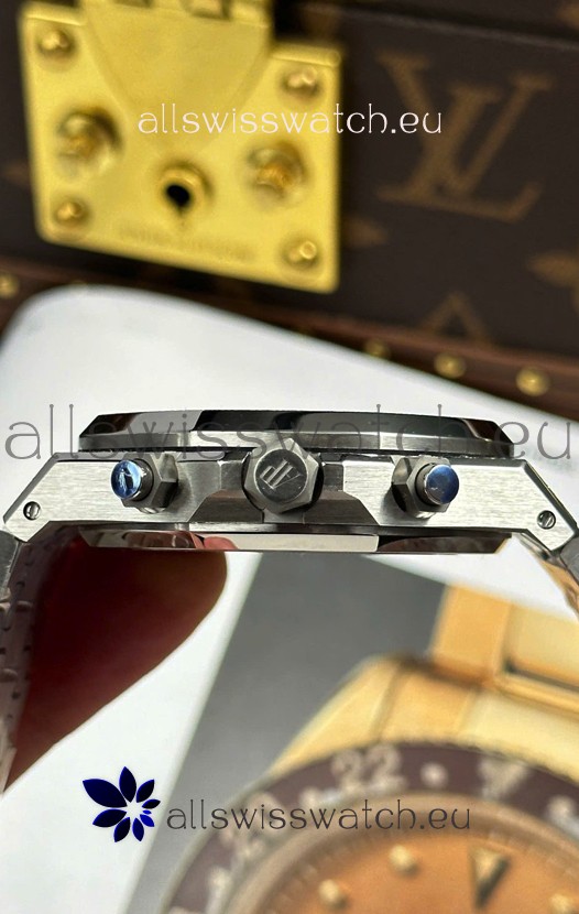 Machinery Layout exactly like Audemars Piguet 4401 Calibre Movement used in Authentic Audemars Piguet Offshore Watches. Built on Genuine Swiss 7753 Movement architecture with Functional stopwatch feature like the authentic with Seconds hand running at the 12 o clock Sub Dial