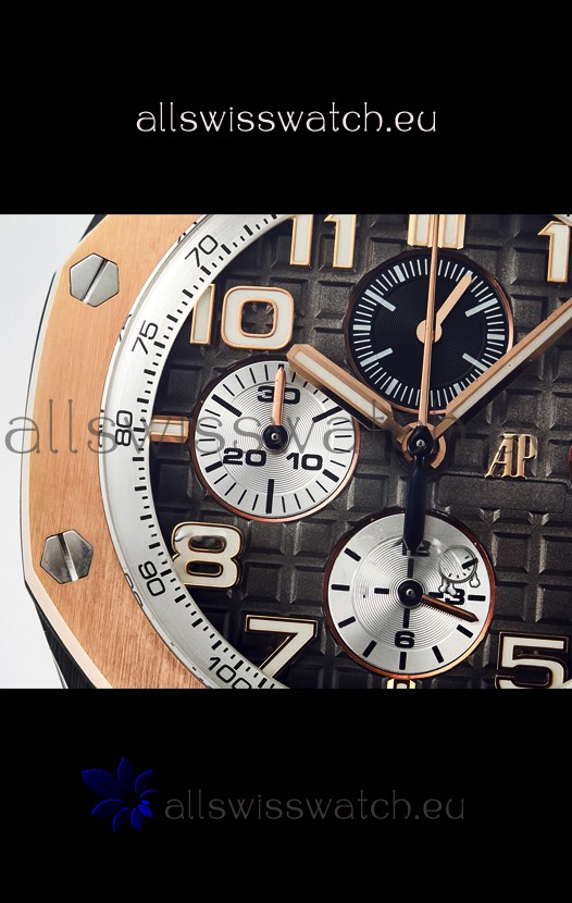 Machinery Layout exactly like Audemars Piguet 3126 Calibre Movement used in Authentic Audemars Piguet Offshore Watches built on Genuine Swiss 7753 Movement architecture with Functional stopwatch feature like the authentic with Seconds hand running at the 12 o clock Sub Dial