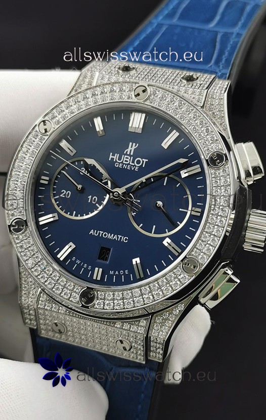 Hublot Classic Fusion Chronograph Steel Diamonds Casing Blue Dial 1:1 Mirror Replica Watch