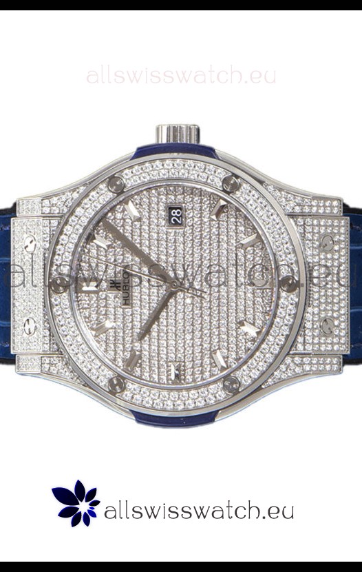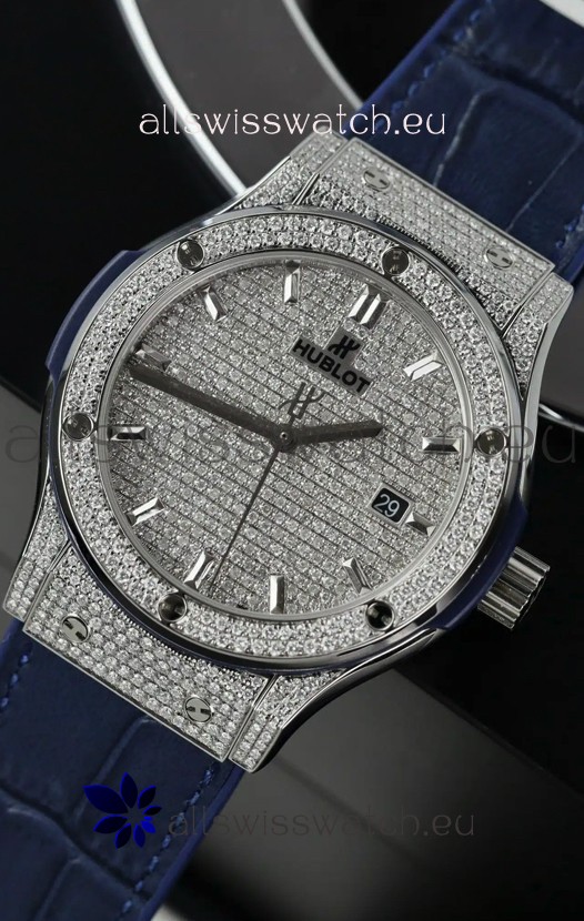 Hublot Classic Fusion Automatic Steel Diamonds Paved Dial Blue Strap 42MM Superclone Replica Watch