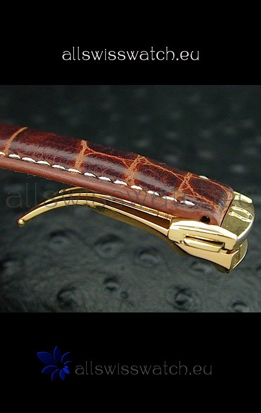 Strap: Brown Leather Strap with Omega Insignia Deployant Buckle in 18K Yellow Gold