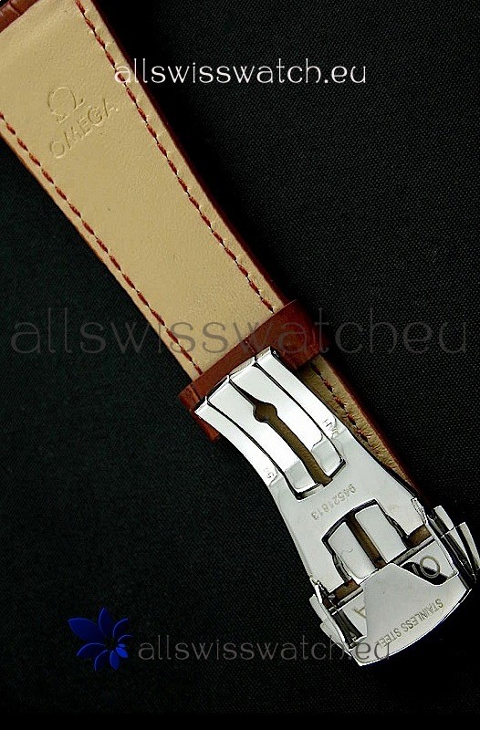Strap: Brown Leather Strap with Omega Insignia Deployant Buckle