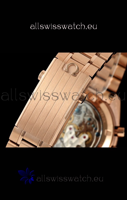 18K Rose Gold Plating on 904L Steel Strap complete with Omega Markings and Engravings with Rose Gold Plated Deployant Buckle complete with Omega Markings and Details