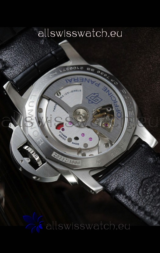 Genuine Swiss Modified 7750 movement Reassembled to resemble the P.900 Movement. Bridges and Rotor Decorated to resemble the Calibre P9001 Movement by Panerai