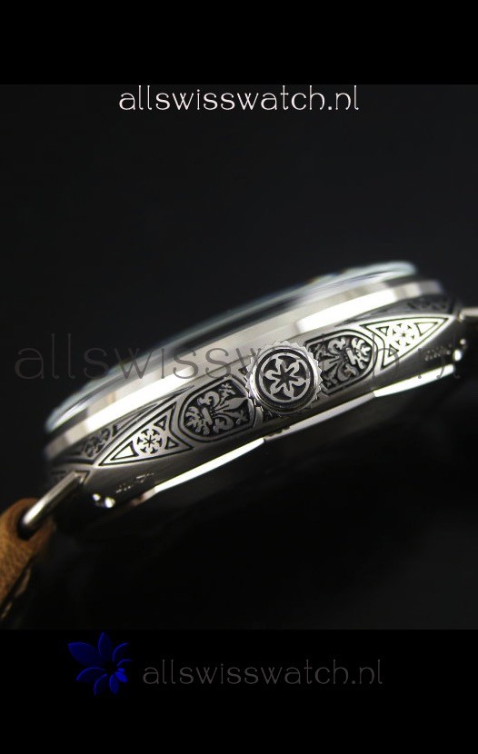 316L Brushed Stainless Steel Case with Floral Motif Engravings on Case and Polished Bezel