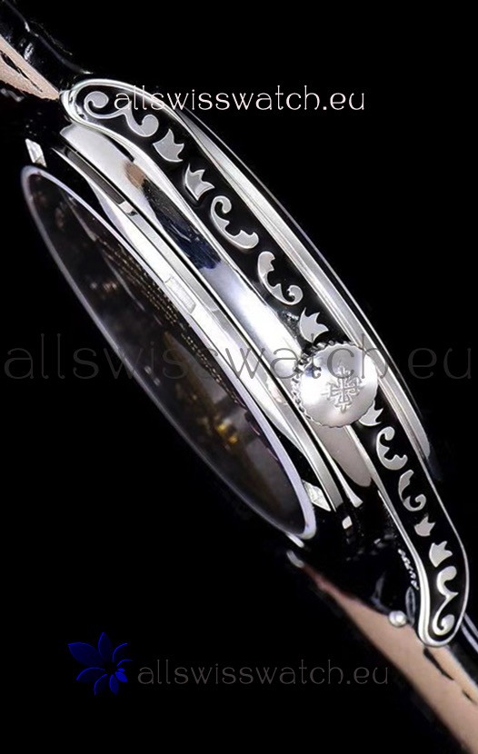 904L Handengraved, Black Enamel Patterned Stainless Steel Case with Open Case Back