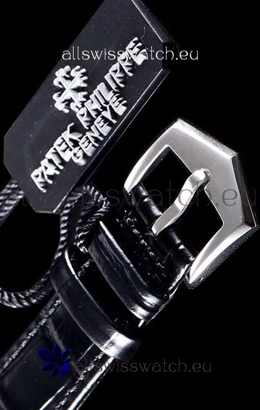 Genuine Black Shiny Alligator Leather Strap with Stainless Steel Tang Buckle complete with Patek Philippe Markings and Engravings