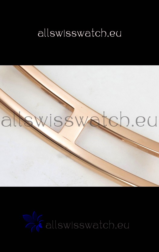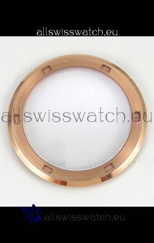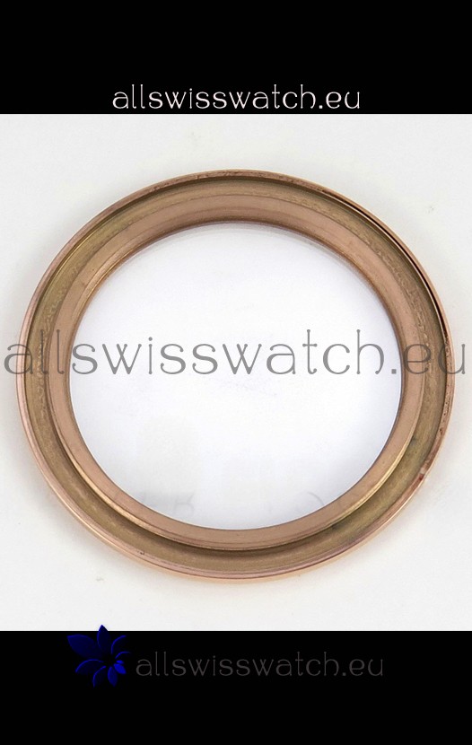 18K Rose Gold Plating on 904L Solid Stainless Steel Case with Open Case Back Cover in Steel. Polished Bezel Borders