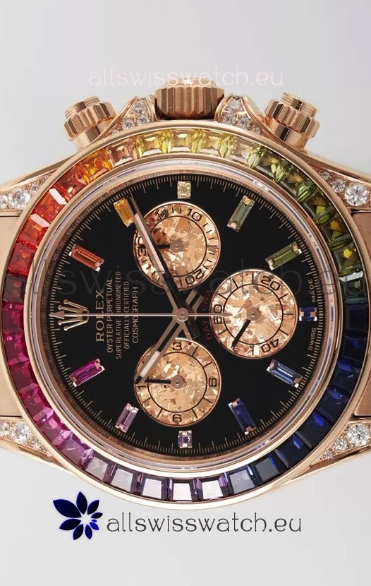 Black Dial with 3 Functional Sub Dials like the Authentic. Rainbow Diamonds Bezel