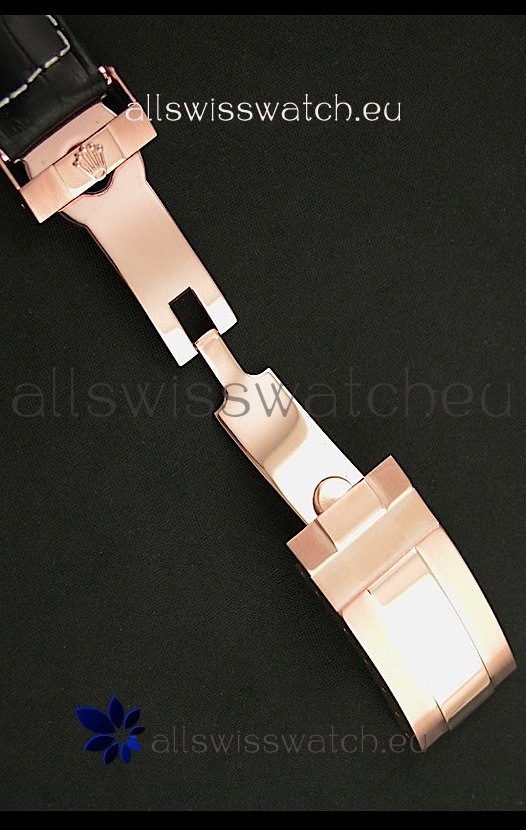 Strap: Black Leather Strap with 18K Rose Gold Plated Double Locking Clasp