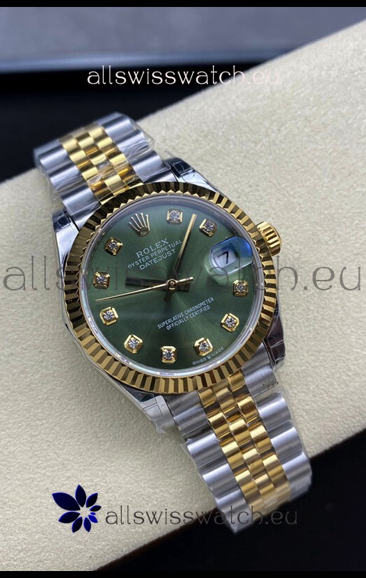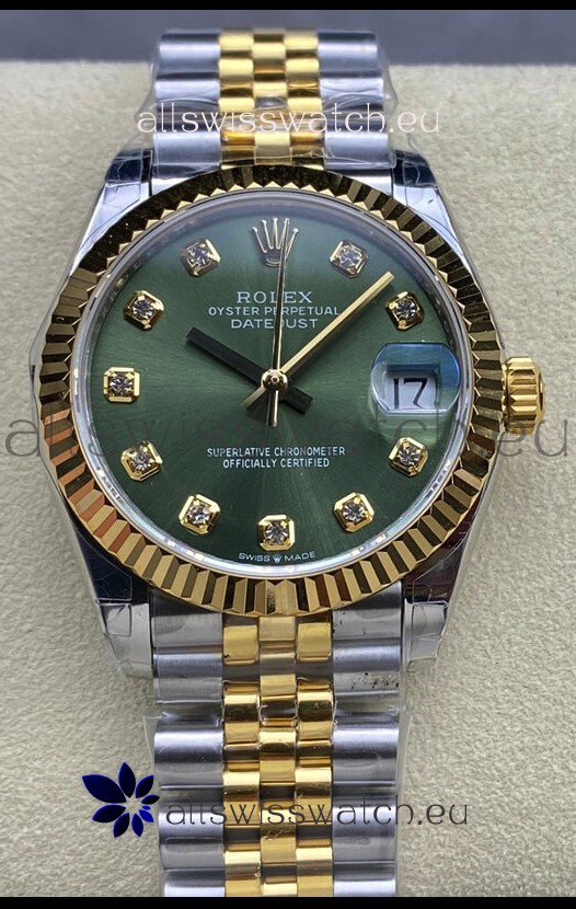 Rolex Datejust 31MM Swiss Watch in 904L Steel Two Tone Yellow Green Dial 1:1 Mirror Replica