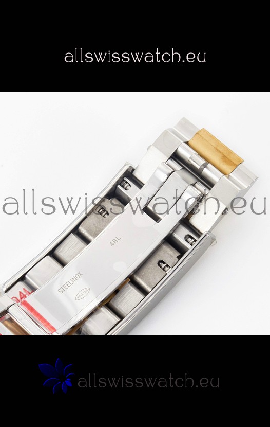 18K 10 Microns Thick Two Tone Gold Plating on 904LL Stainless Steel Oyster Bracelet with Brushed Finish and new design Diver's Extension. Bracelet's been updated with Ball Bearings in Ceramic in Latch Mechanism and Buckle has been updated with much better Finishing and Crisp Markings.